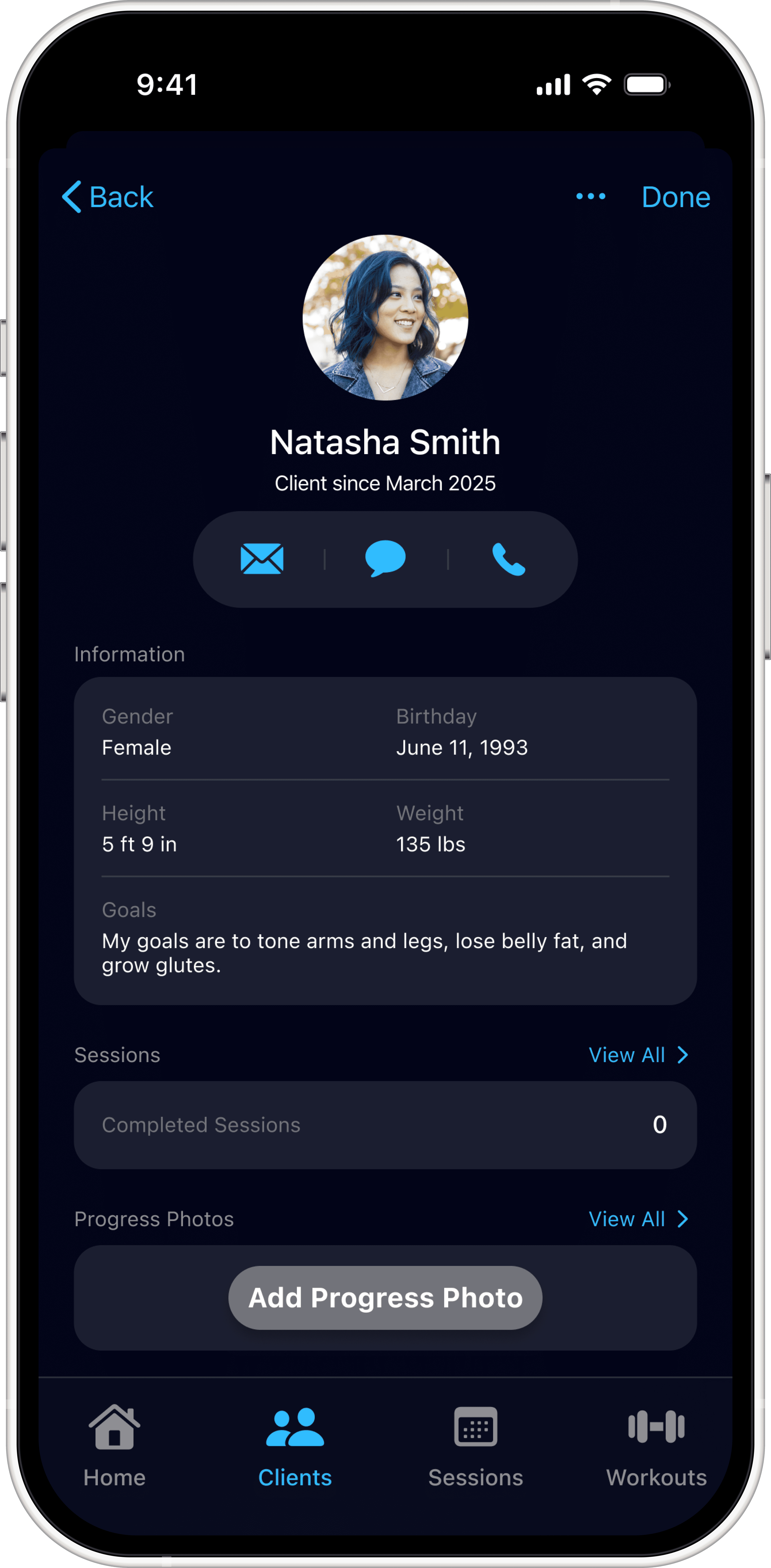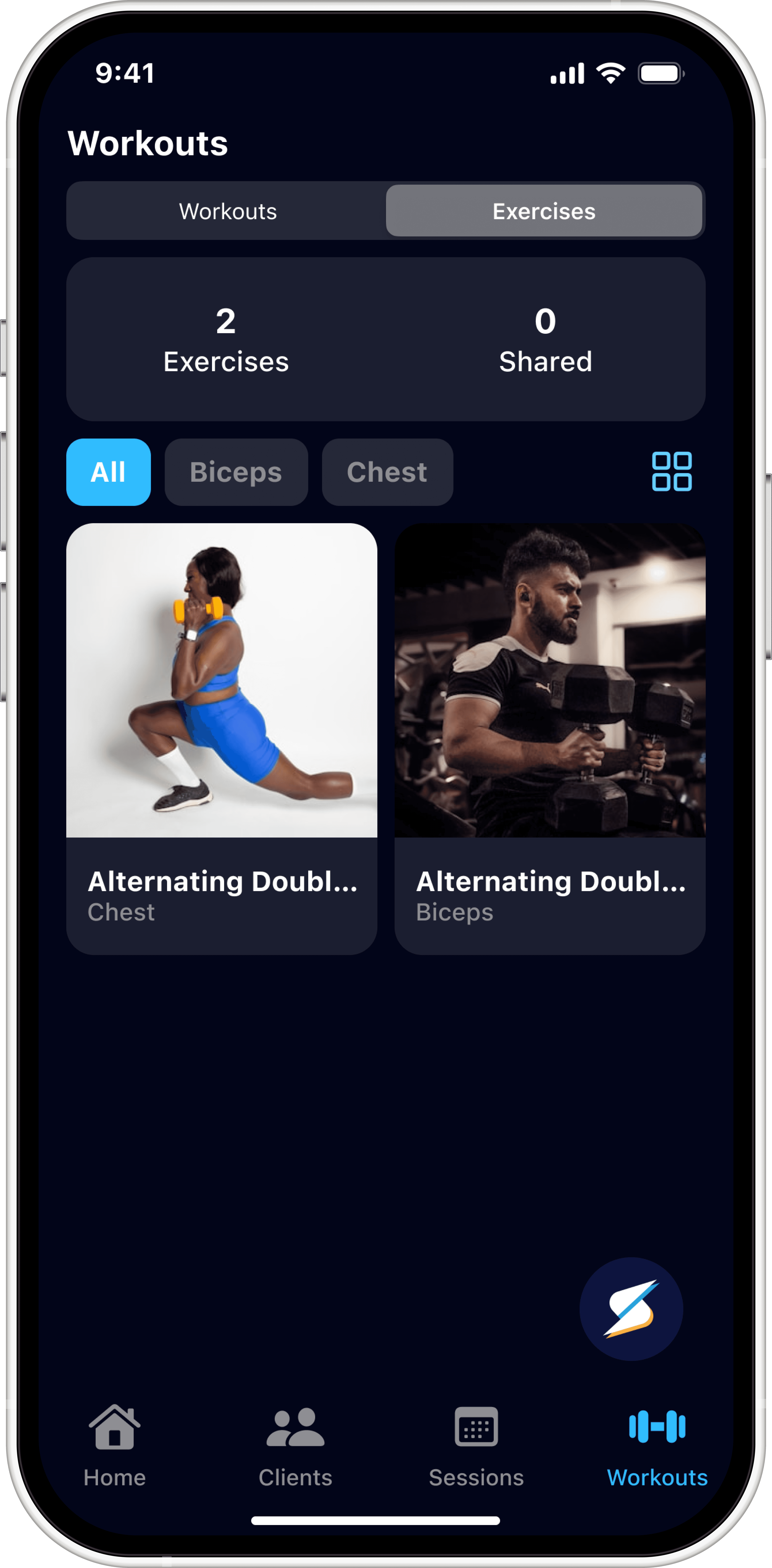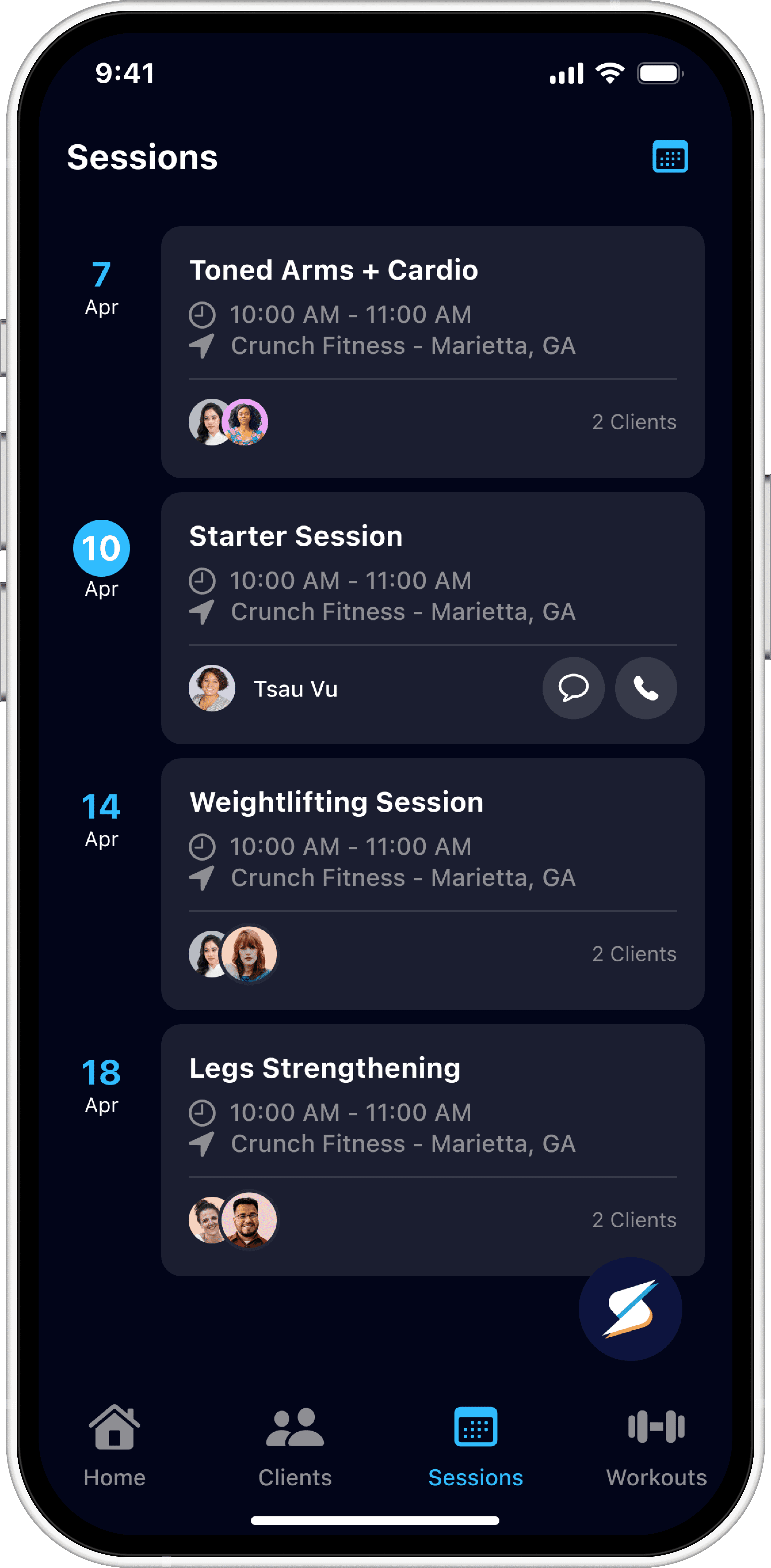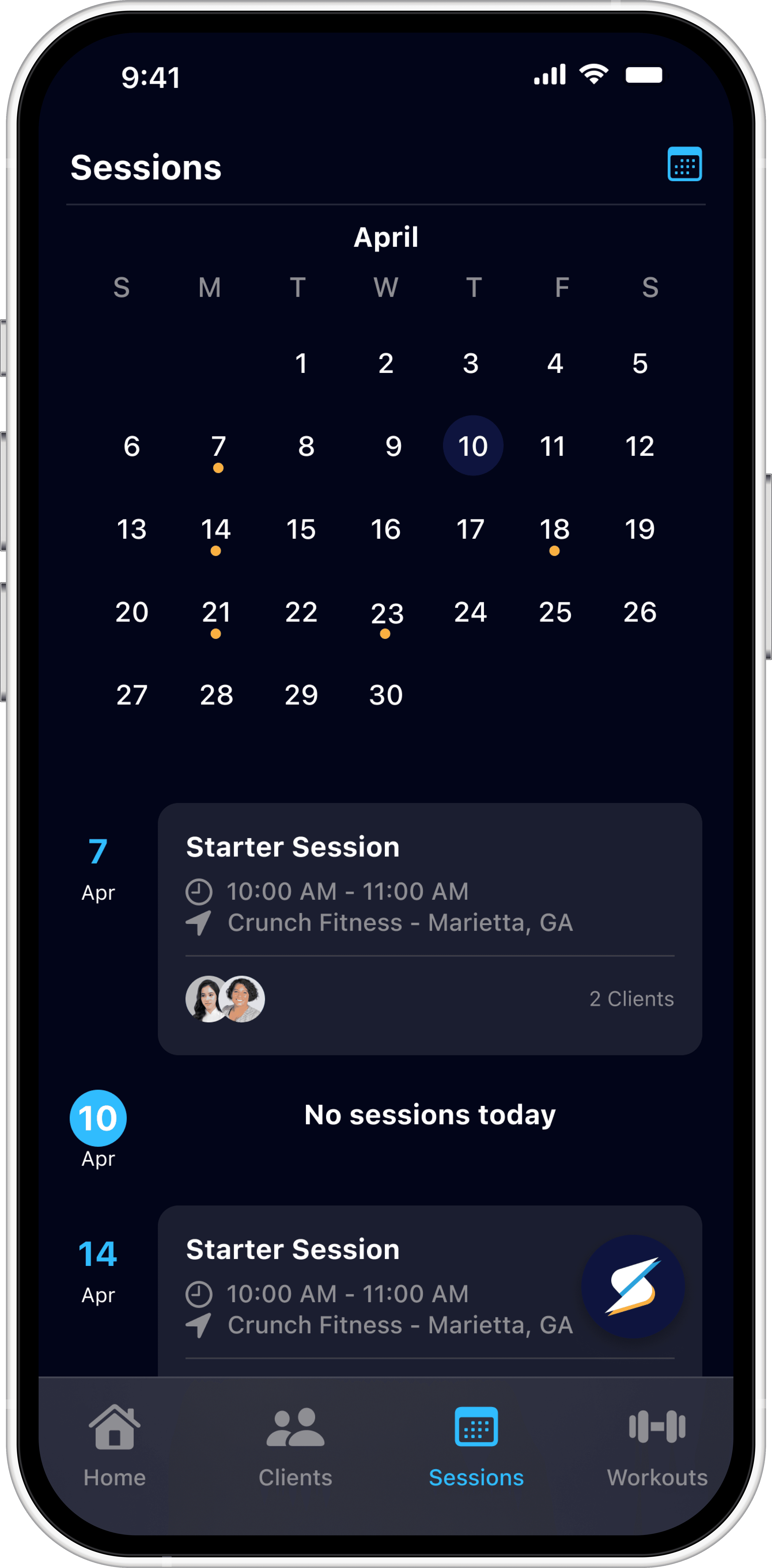 Existing UI elements varied across the Clients, Sessions, and Workouts screens.