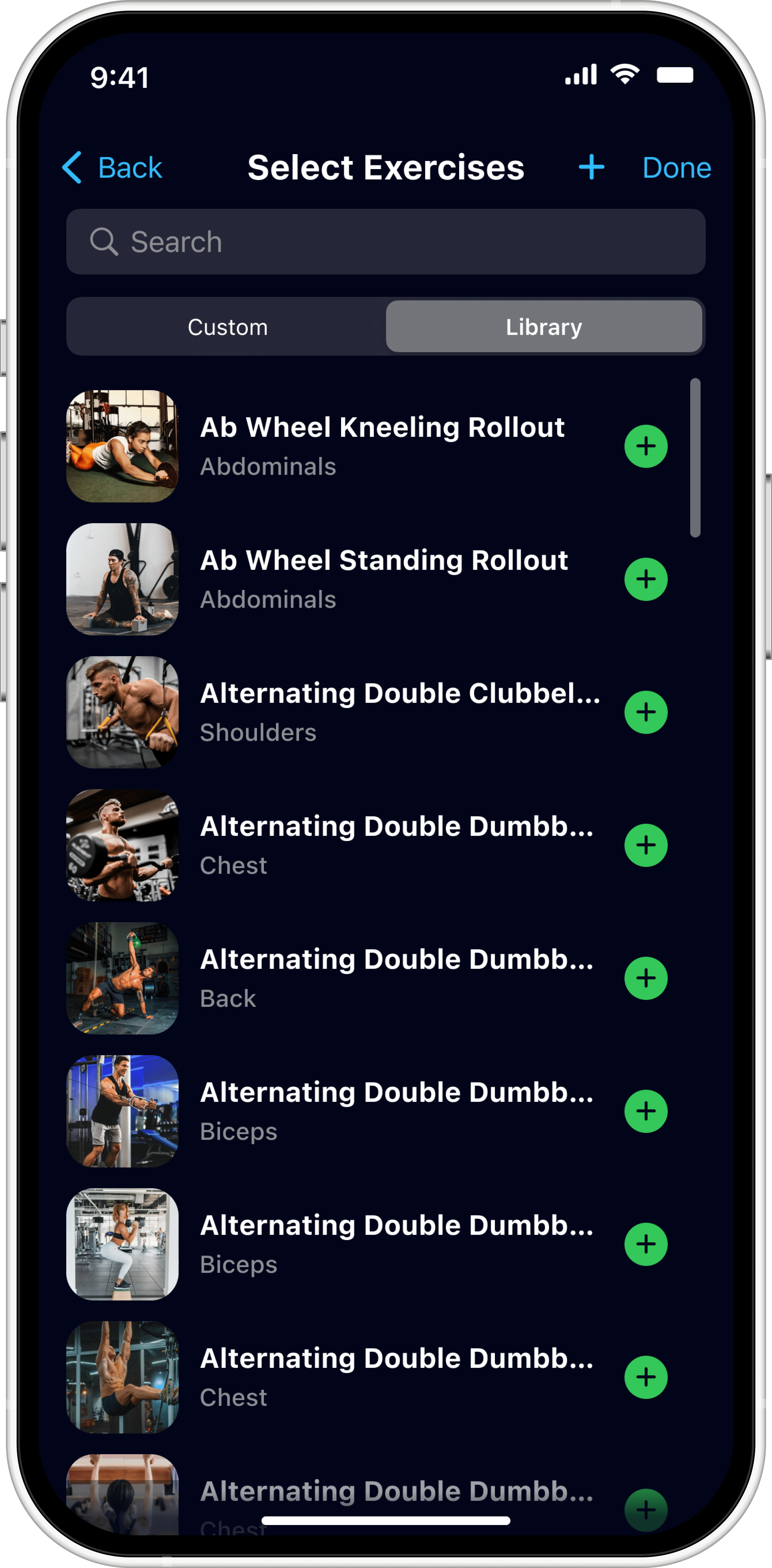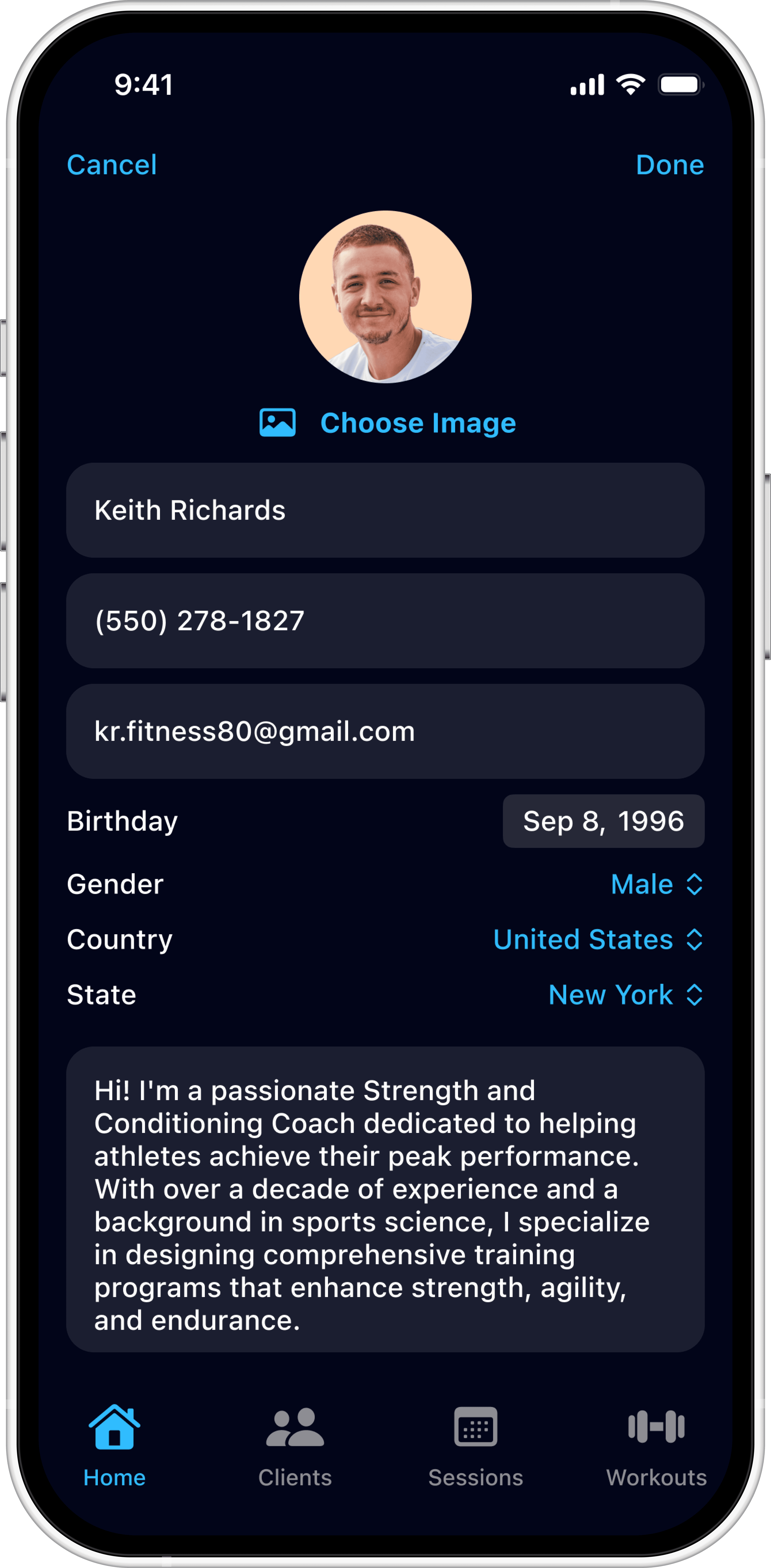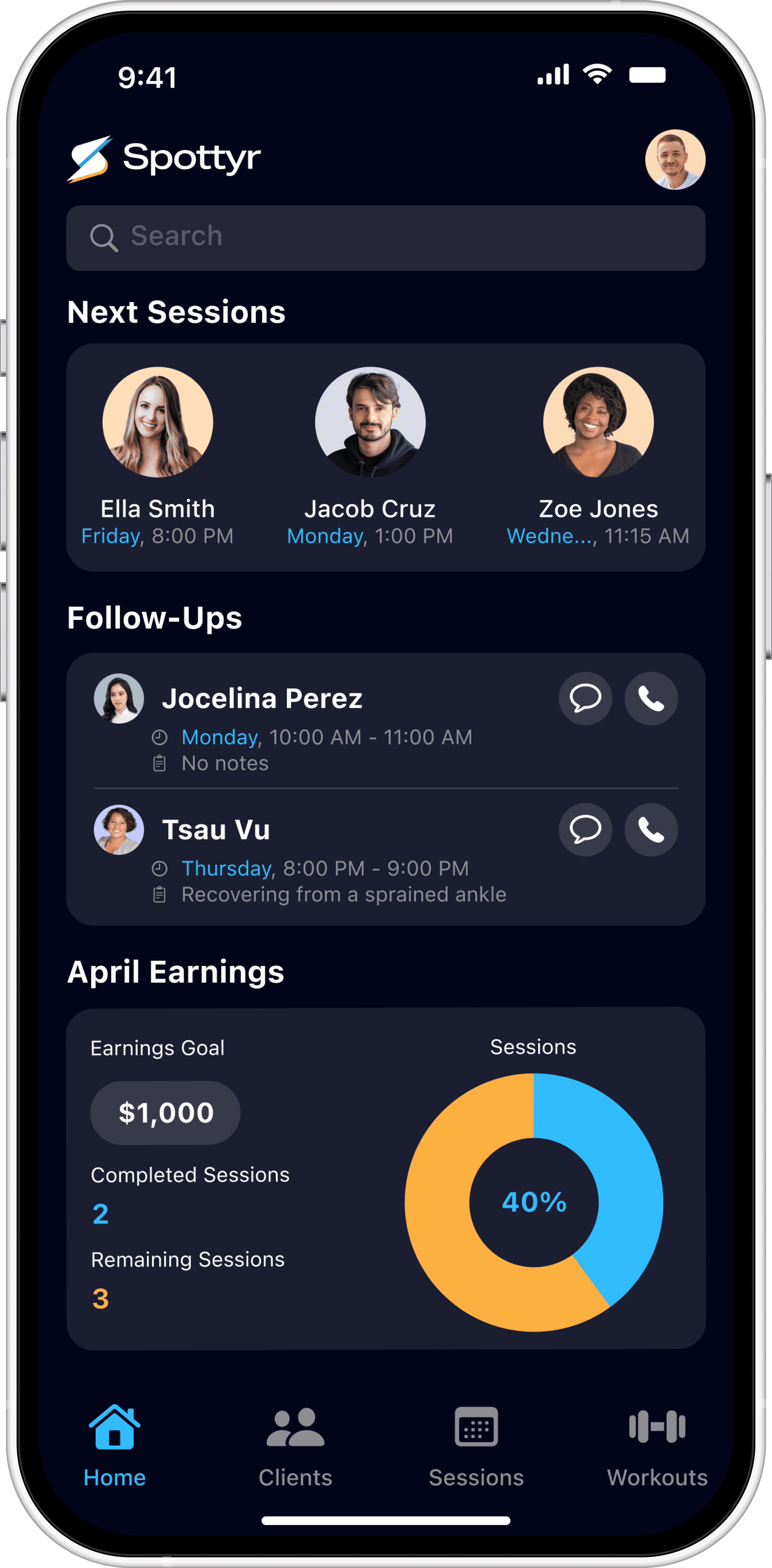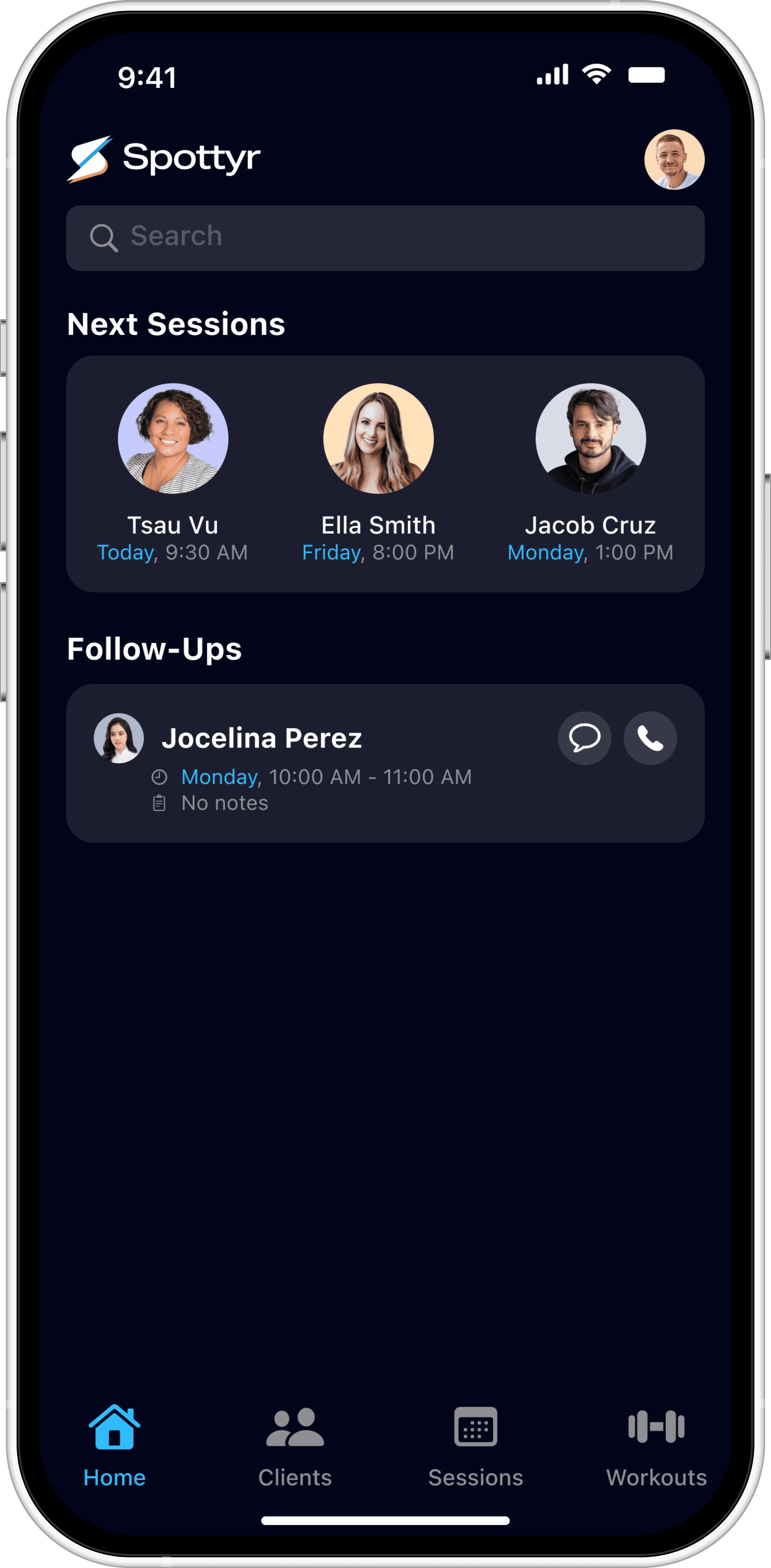 Existing UI elements varied across the Clients, Sessions, and Workouts screens.